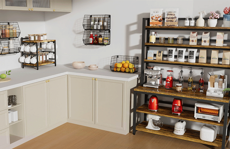 - Offene Regale bieten reichlich Stauraum: Das mit einem offenen Aufsatz verbundene Bäckerregal vergrößert den organisierten Raum und spart Bodenfläche, während es gleichzeitig die Aufbewahrungsmöglichkeiten verbessert. Alle darauf platzierten Küchenutensilien sind leicht zugänglich.